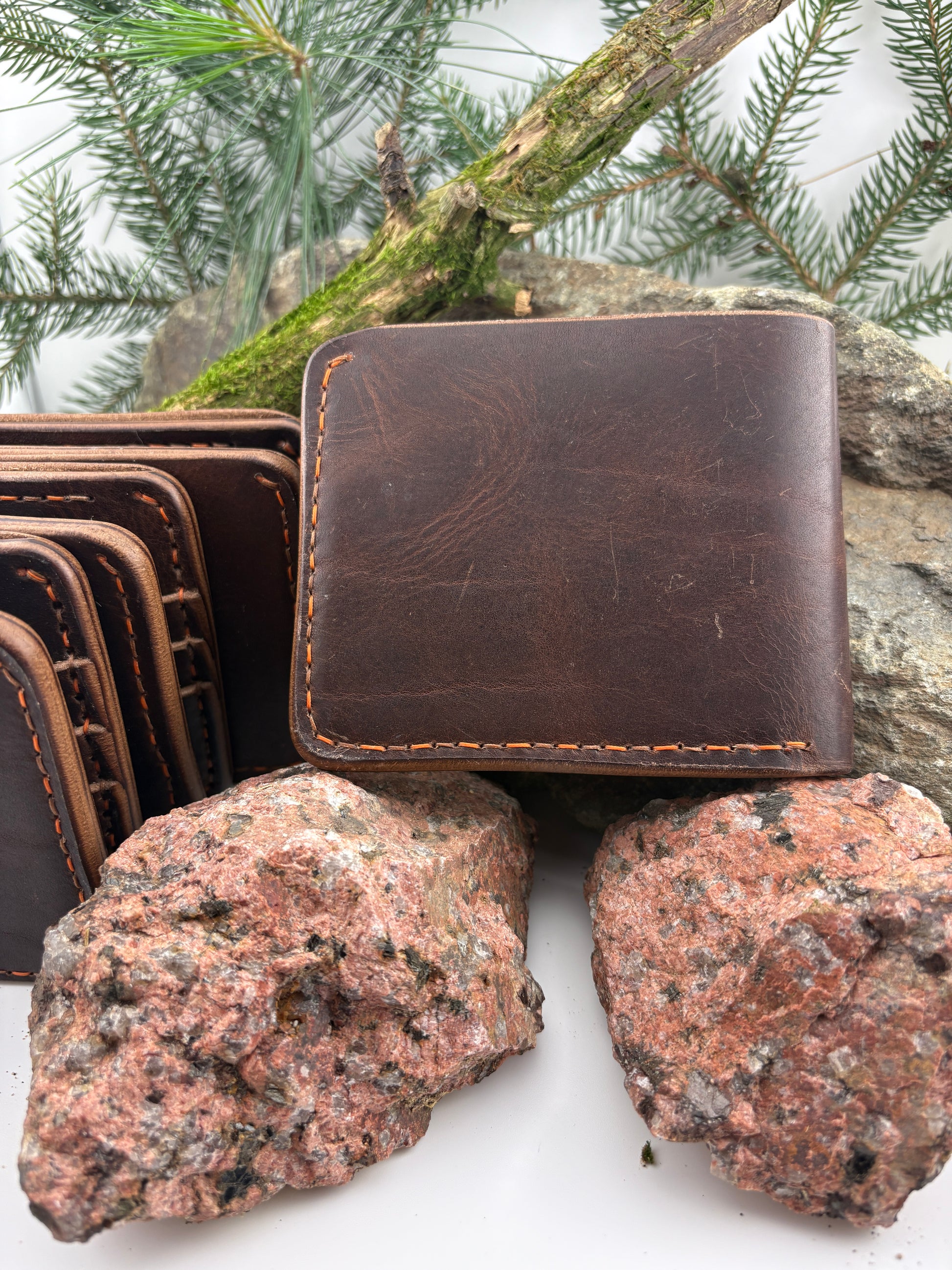 Brown Nut Horween Derby Tan with Brown & Blaze Orange Ritza Tiger Thread. The natural dark browns and peaks of orange brining you back to the early mornings watching the sunrise from the deer stand. This wallet is perfect for any hunter or outdoorsman as it is not only functional and long lasting but a true piece of luxury made with the Famous Horween Leather.
